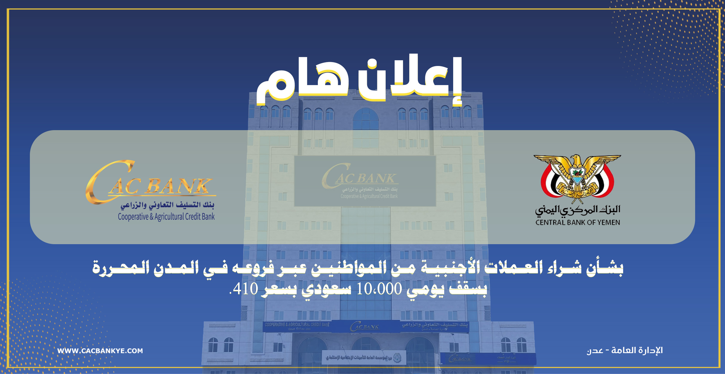 وتماشيا مع تنفيذ السياسات النقدية للبنك المركزي اليمني ،يعلن كاك بنك عن شراء العملات الأجنبية من المواطنين عبر فروعه في المدن المحررة بسقف يومي 10,000 سعودي بسعر 410.