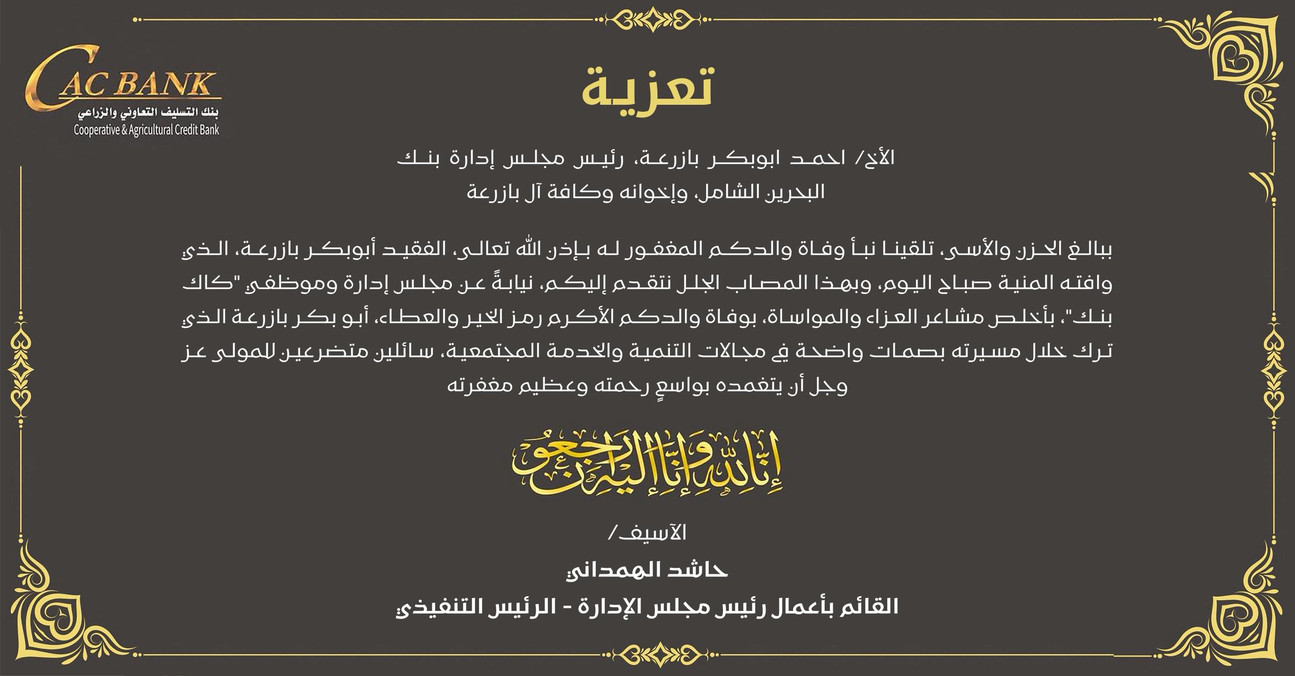 وبهذا المصاب الجلل نتقدم إليكم، نيابةً عن مجلس إدارة وموظفي “كاك بنك”، بأخلص مشاعر العزاء والمواساة، بوفاة والدكم الأكرم رمز الخير والعطاء، أبو بكر بازرعة الذي ترك خلال مسيرته بصمات واضحة في مجالات التنمية والخدمة المجتمعية، وإرثًا طيبًا وذكرى عطرة في قلوب من عرفه، سائلين المولى عز وجل أن يتغمده بواسع رحمته ويسكنه فسيح جناته، وأن يلهمكم وأسرتكم الكريمة جميل الصبر والسلوان.