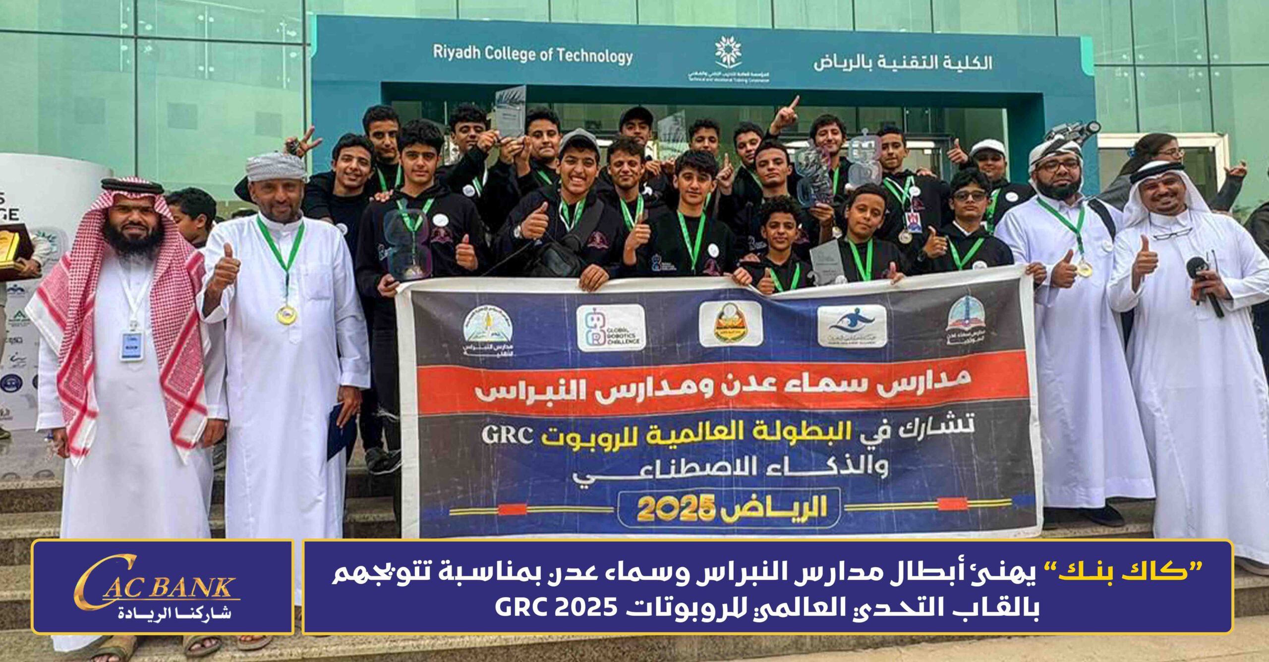 بمناسبة تتويج أبطال عدن بأرفع ألقاب التحدي العالمي للروبوتات GRC 2025، يتقدم بنك التسليف التعاوني والزراعي – كاك بنك بأسمى آيات التهاني والتبريكات لأبطال اليمن من أشبال سماء عدن والنبراس، وذلك بمناسبة الإنجاز التاريخي الذي حققوه بحصولهم على أرفع ألقاب التحدي العالمي للروبوتات GRC 2025، الذي استضافته العاصمة السعودية الرياض بمشاركة 750 متسابقًا يمثلون 250 فريقًا من مختلف دول العالم، خلال يومي 8 و9 ديسمبر.