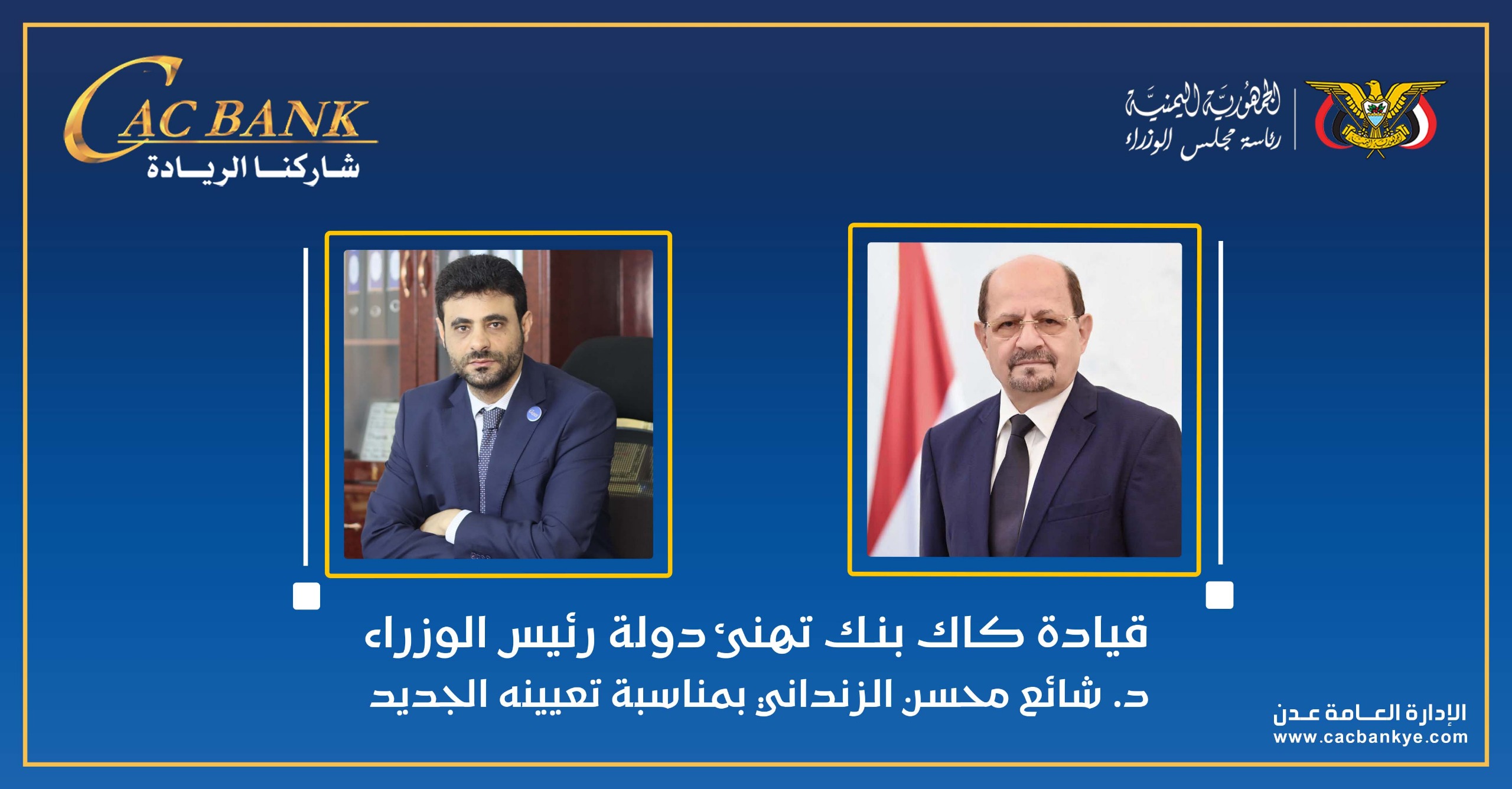 يتقدم القائم بأعمال رئيس مجلس إدارة بنك التسليف التعاوني والزراعي (كاك بنك) الرئيس التنفيذي، الأستاذ حاشد الهمداني، بأصدق التهاني والتبريكات إلى الدكتور شائع محسن الزنداني، بمناسبة صدور قرار تعيينه رئيسًا لمجلس الوزراء وتكليفه بتشكيل الحكومة.