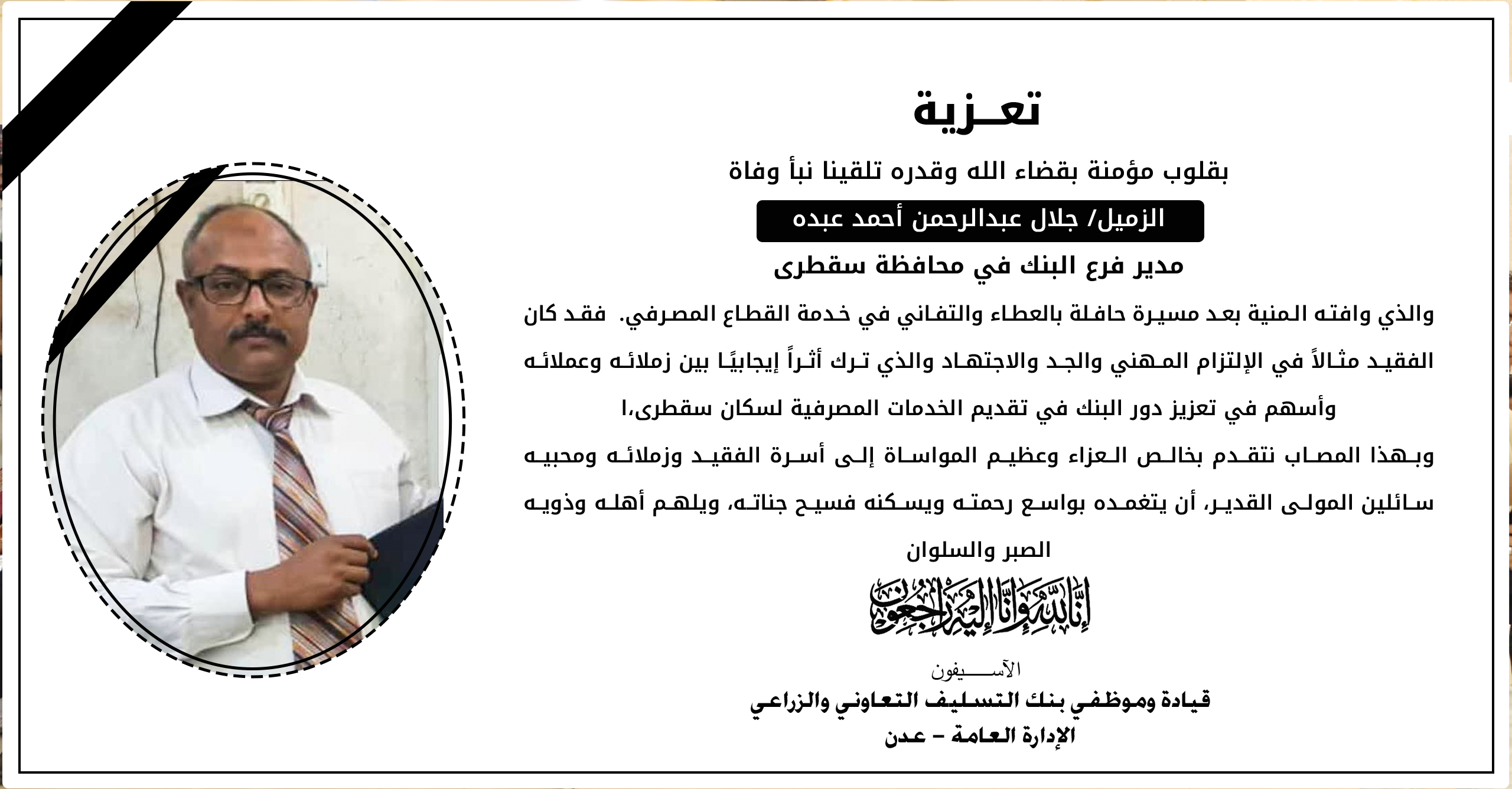 وأكد أن الفقيد كان مثالًا للجد والاجتهاد، وأسهم في تعزيز دور البنك في تقديم الخدمات المصرفية لسكان سقطرى، داعيًا الله أن يتغمده بواسع رحمته ويسكنه فسيح جناته، ويلهم أهله وذويه الصبر والسلوان، إنا لله وإنا إليه راجعون.