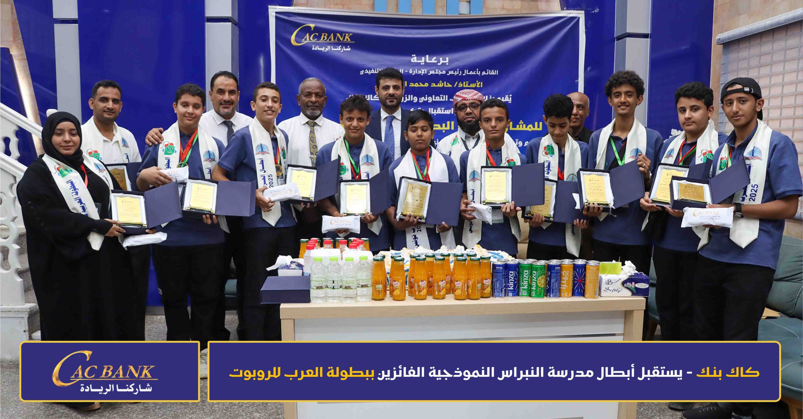 استقبل القائم بأعمال رئيس مجلس الإدارة الرئيس التنفيذي لبنك التسليف التعاوني والزراعي (كاك بنك)، الأستاذ/ حاشد الهمداني أبطال مدارس النبراس وسماء عدن النموذجية، الحائزين على لقب بطل العرب في البطولة العربية الخامسة عشرة للروبوت، والتي أقيمت في تونس.