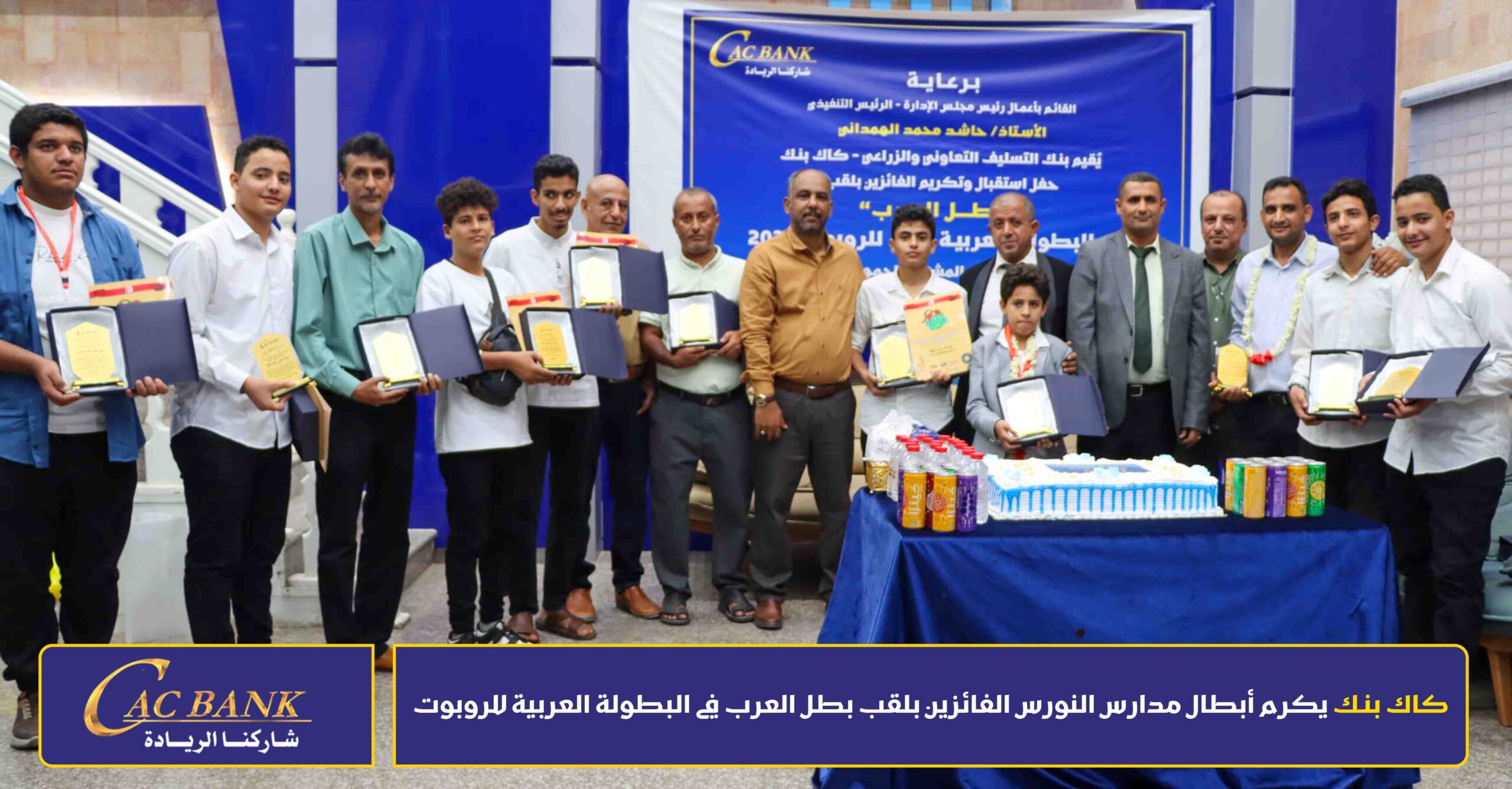 وكان بنك التسليف التعاوني والزراعي «كاك بنك» قد كرم الشهر الماضي، صاحبي المركز الثاني والثالث في البطولة العربية للروبورت، والتي توج فيها طلاب مجموعة مدارس سماء عدن والنبراس النموذجيه.