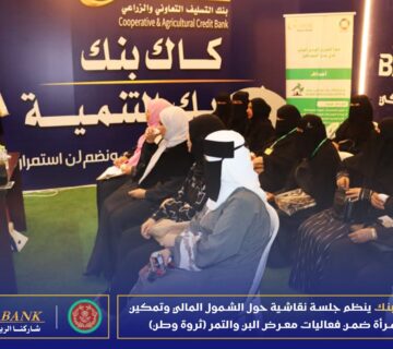 نفّذ القطاع الزراعي والسمكي والتنمية المستدامة في بنك التسليف التعاوني والزراعي “كاك بنك”، برعاية معالي وزير الزراعة والري والثروة السمكية اللواء الركن سالم عبدالله السقطري، والقائم بأعمال رئيس مجلس الإدارة الرئيس التنفيذي للبنك الأستاذ حاشد الهمداني، ورشة عمل متخصصة بعنوان “الاحتياجات التمويلية لسلاسل القيمة لمحاصيل البن والتمر”، وذلك خلال اليوم الثالث من فعاليات معرض البن والتمر “ثروة وطن”.