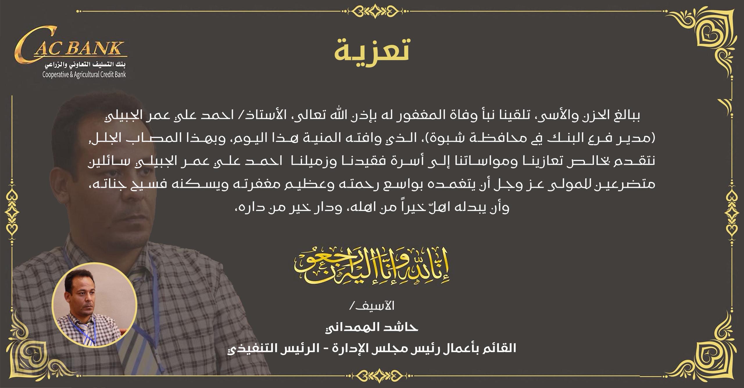 بقلوب مؤمنة بقضاء الله وقدره، وببالغ مشاعر الحزن والأسى، يتقدم جميع موظفي ومنتسبي بنك التسليف التعاوني والزراعي (كاك بنك) بخالص التعازي وصادق المواساة إلى أسرة فقيدنا وزميلنا العزيز الأستاذ/ أحمد علي عمر الجبيلي، مدير فرع البنك في محافظة شبوة، الذي انتقل إلى جوار ربه بعد حياة حافلة بالعطاء والعمل الجاد في خدمة البنك والوطن.