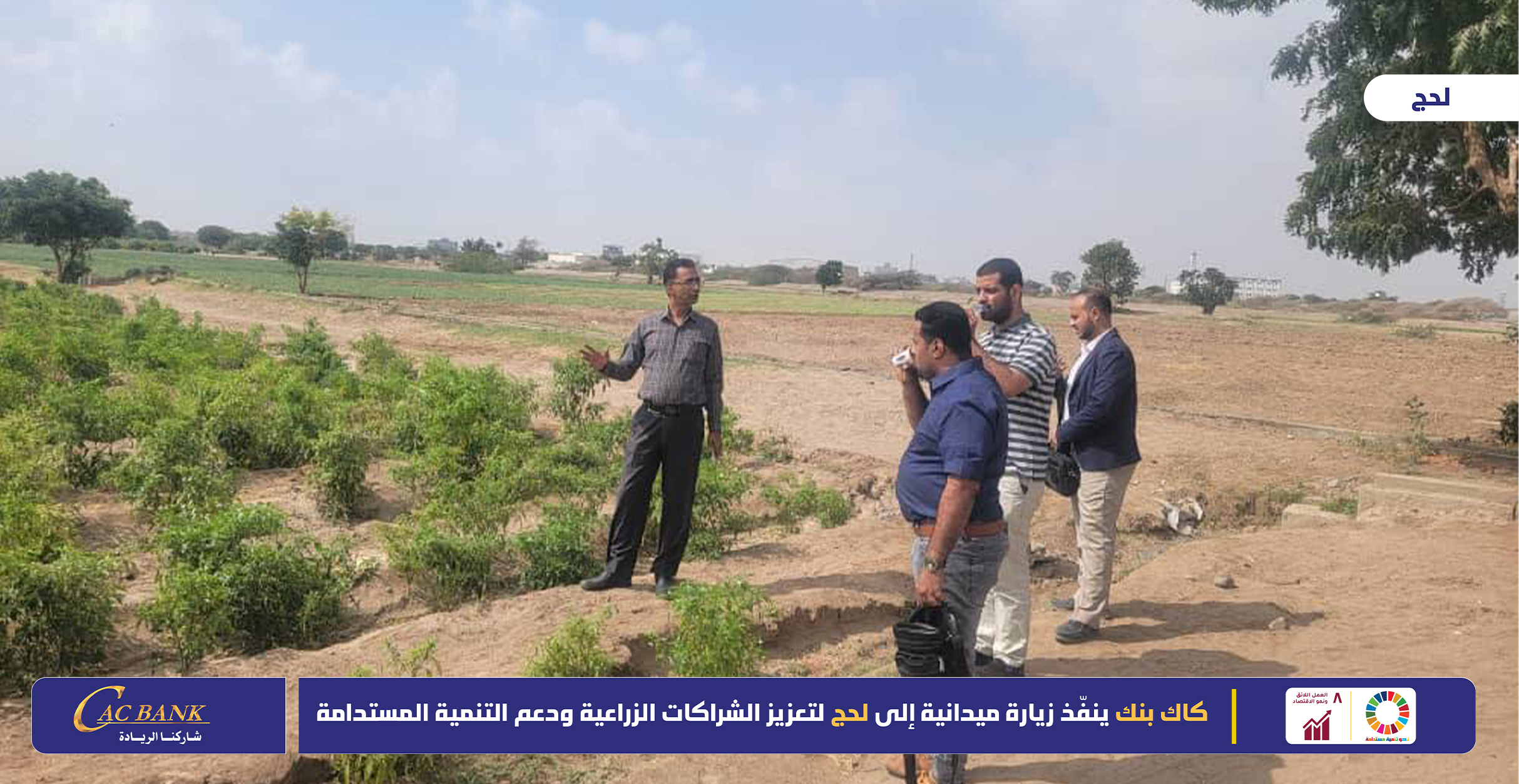 نفّذ القطاع الزراعي والسمكي والتنمية المستدامة في بنك التسليف التعاوني والزراعي (كاك بنك)، يوم الخميس الموافق 12 فبراير 2026م، زيارة ميدانية استطلاعية إلى محافظة لحج، في إطار توجهات البنك الرامية إلى دعم القطاع الزراعي وتعزيز الشراكات التنموية المستدامة، والاطلاع عن كثب على واقع النشاط الزراعي في المحافظة.