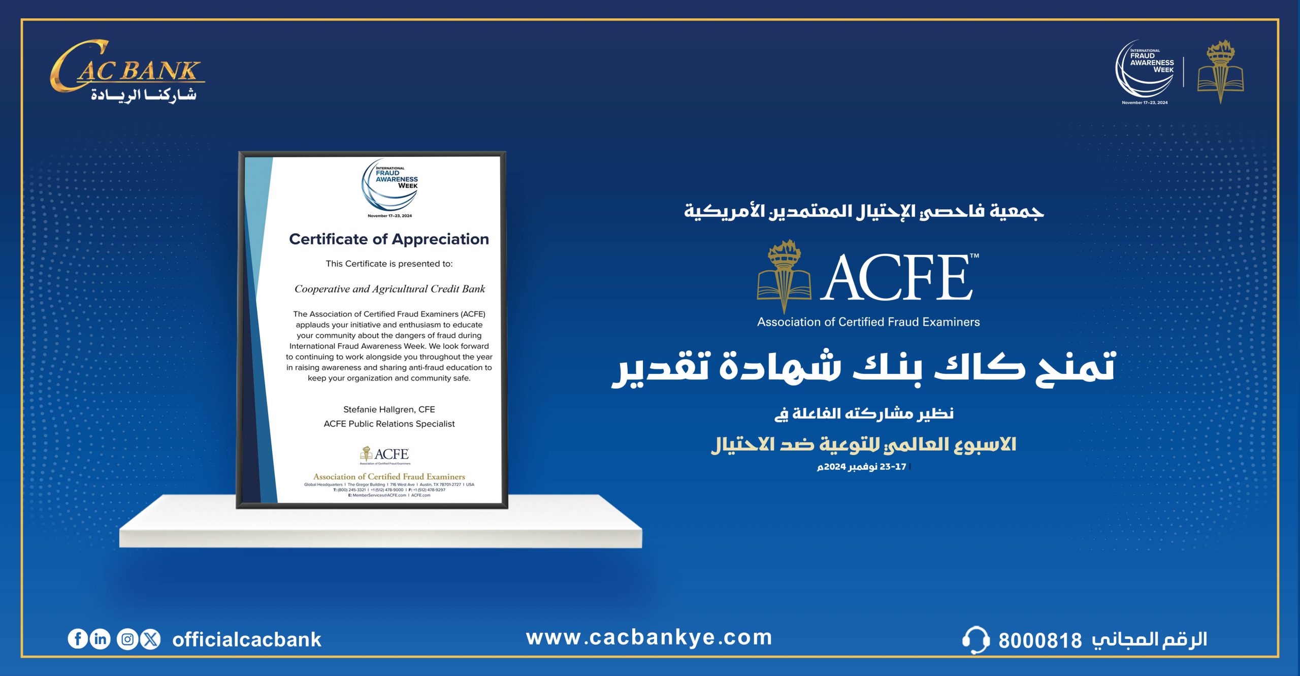 منحت جمعية فاحصي الاحتيال المعتمدين الأمريكية Association of Certified Fraud Examiners شهادة تقدير لبنك التسليف التعاوني والزراعي «كاك بنك» للعام الرابع على التوالي، لالتزامه وجهوده في فعالية الأسبوع العالمي للتوعية ضد الاحتيال خلال الفترة من 17_23 من شهر نوفمبر الماضي 2024.